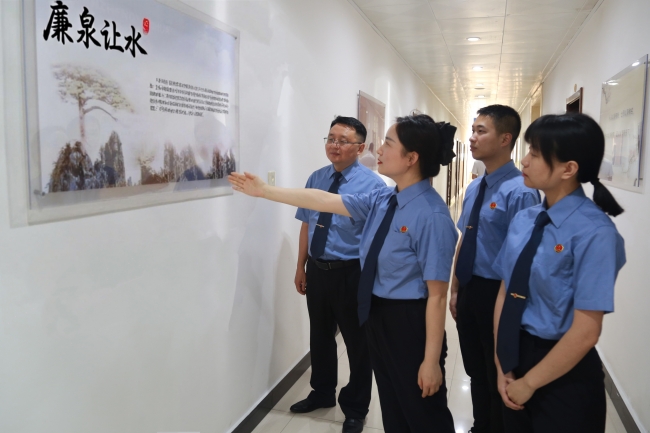 6月27日,陕西省汉中市南郑区检察院青年干警在清廉长廊驻足学习“廉泉让水”的典故。